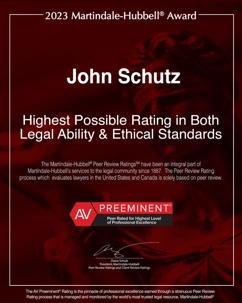 John F. Schutz’s AV rating is a testament to his exceptional legal skills and unwavering dedication to the highest professional and ethical standards. Peers and legal community members have recognized his expertise, integrity, and commitment to achieving the best possible outcomes for his clients.